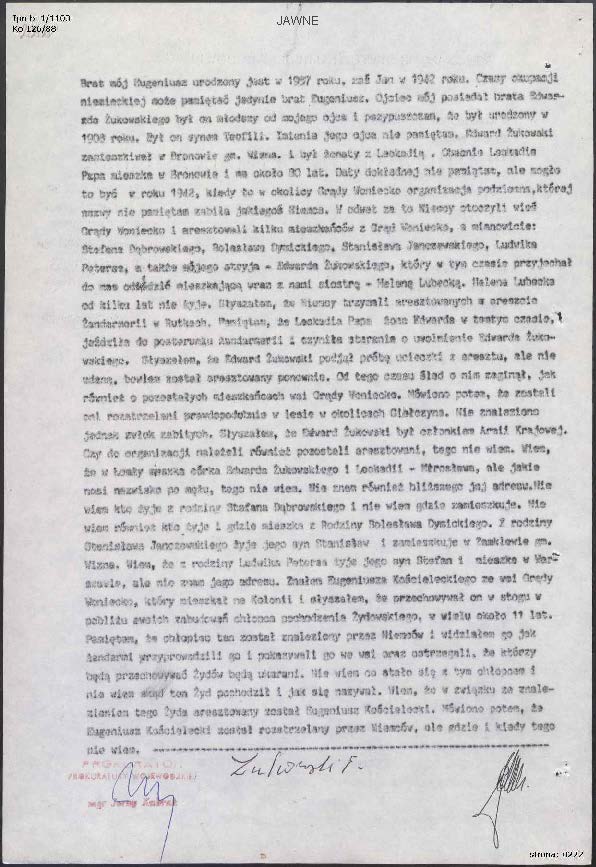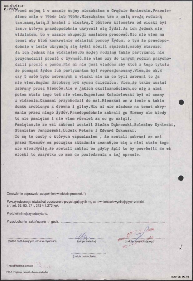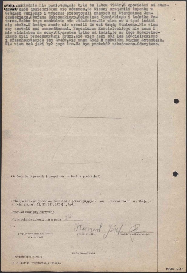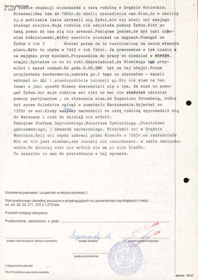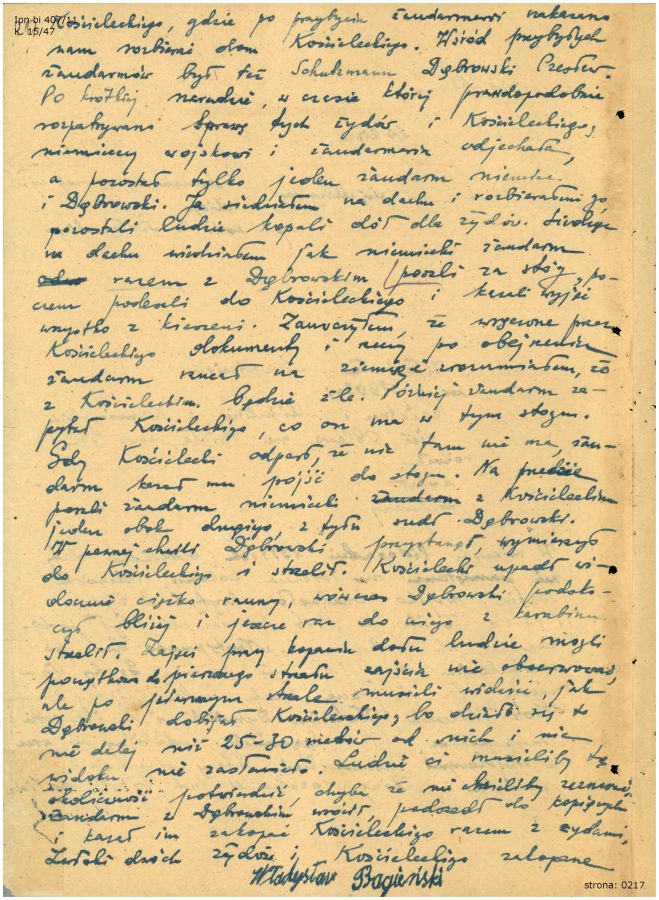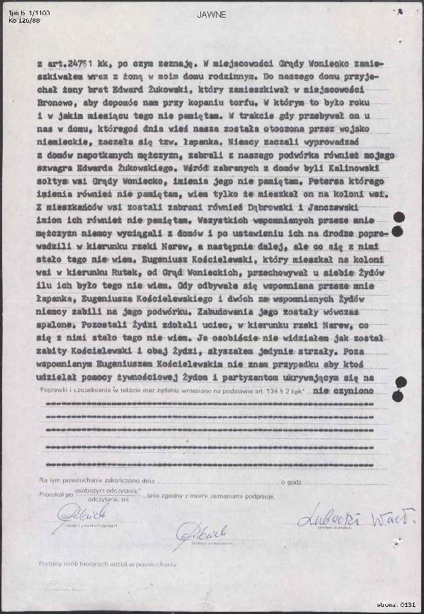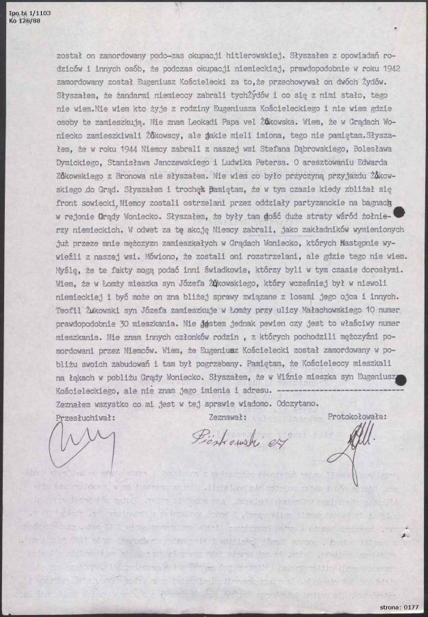 21 listopada 1943 roku, podczas polowania w Grądach-Woniecku, Niemcy odkryli ludzkie ślady w pobliżu leżącego tuż pod lasem gospodarstwa, którego właścicielem był Piotr Kościelecki. Doprowadziły ich one do Żydów, którzy uciekli z likwidowanych z końcem 1942 roku okolicznych gett i ukrywali się w stogach siana. Troje z nich Niemcy zabili na miejscu. Pozostałym, w tym nieznanej z nazwiska kobiecie, udało się uciec. Piotra nie było wtedy w gospodarstwie. Następnego dnia Niemcy przyjechali ponownie. Zastawszy Piotra Kościeleckiego, wyprowadzili go z domu, pobili, a potem zastrzelili.
