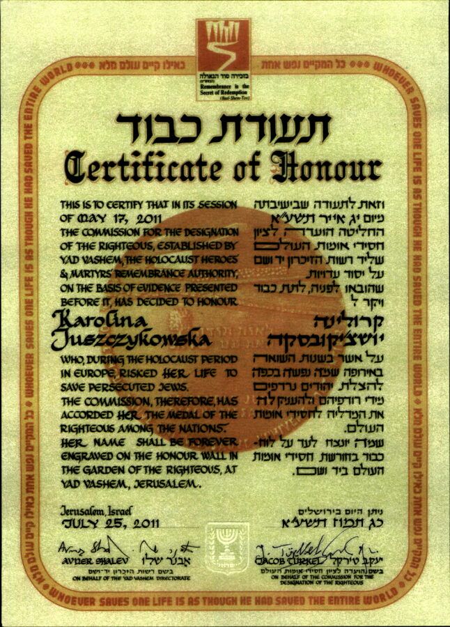 Karolina Juszczykowska mieszkała samotnie w Tomaszowie Mazowieckim i pracowała jako kucharka. Podczas okupacji niemieckiej jej skromna pensja z trudem starczała na przeżycie. Na początku czerwca 1944 roku dwaj Żydzi poprosili ją o schronienie za niewielką opłatą. Zgodziła się, choć wiedziała, że grożą za to surowe represje. Przez sześć tygodni mężczyźni mieszkali razem z nią w jednym pokoju.