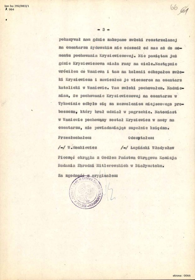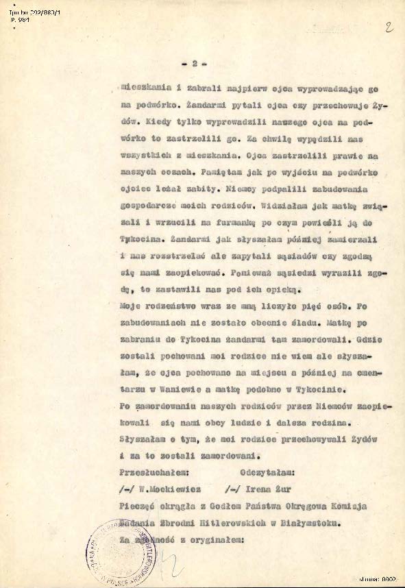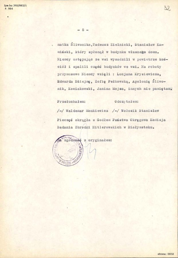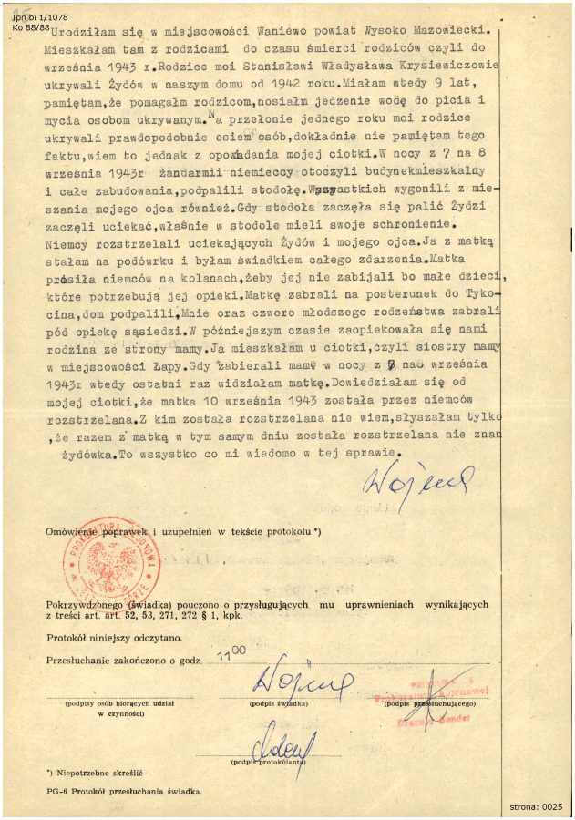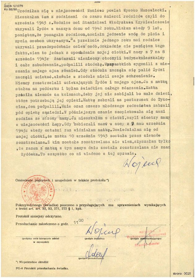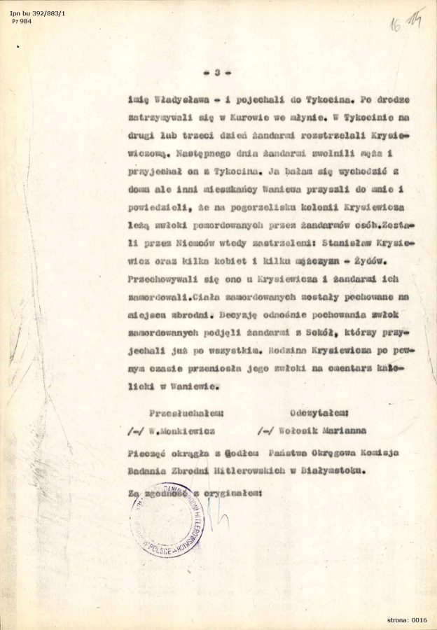 W nocy z 7 na 8 września 1943 roku gospodarstwo otoczyli niemieccy żandarmi. Wywlekli Stanisława z domu, pobili go do nieprzytomności, wreszcie zastrzelili. Następnie podpalili zabudowania i zamordowali uciekających Żydów. Władysława zginęła trzy dni później, po serii brutalnych przesłuchań w areszcie w Tykocinie.