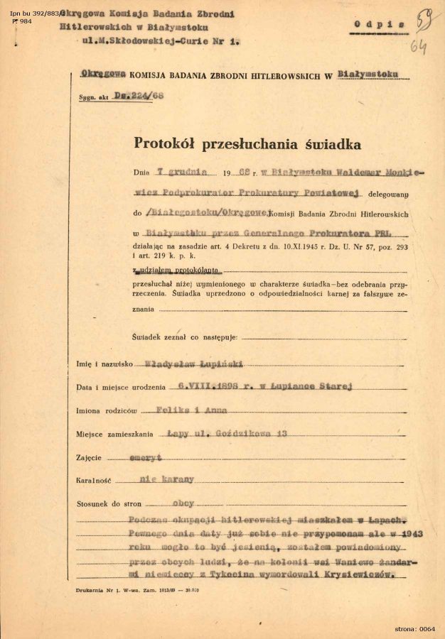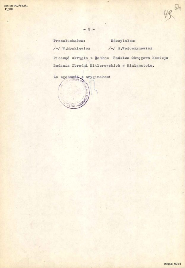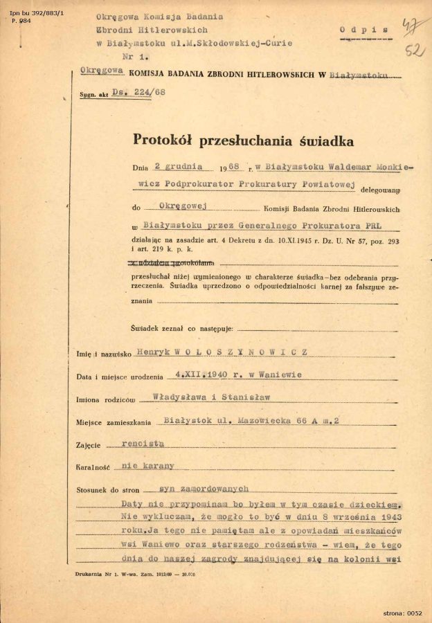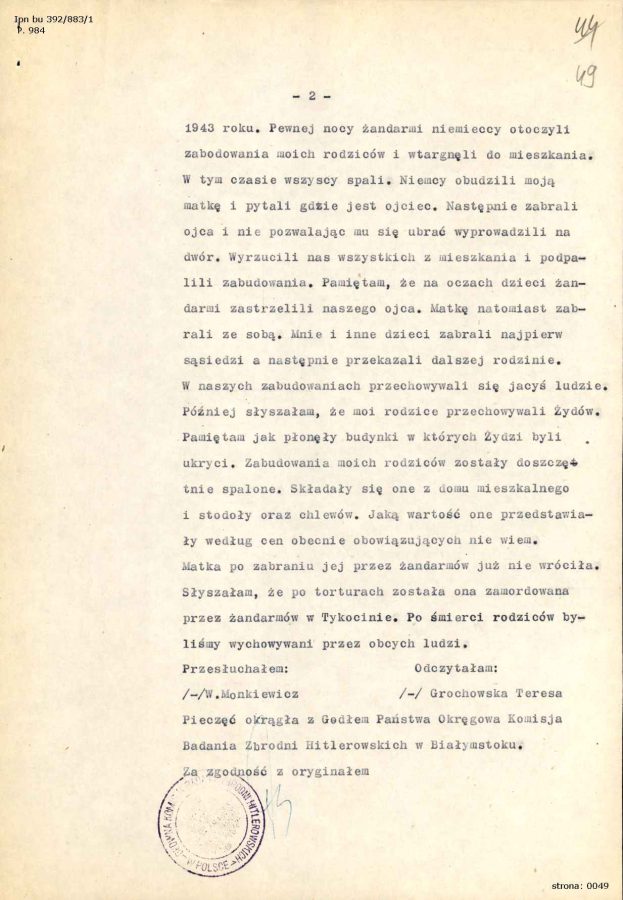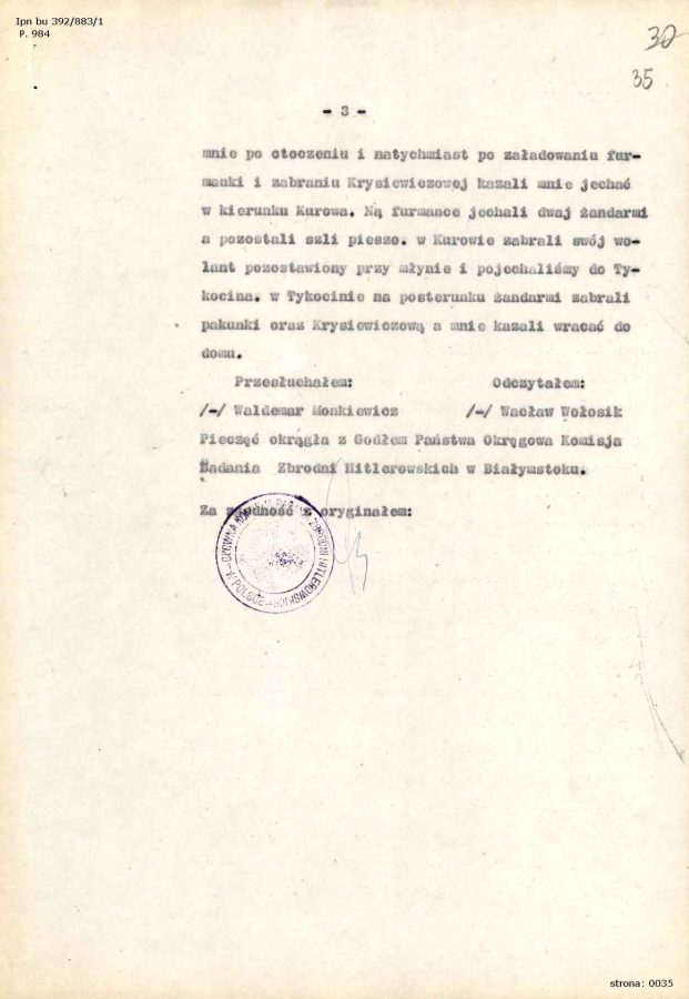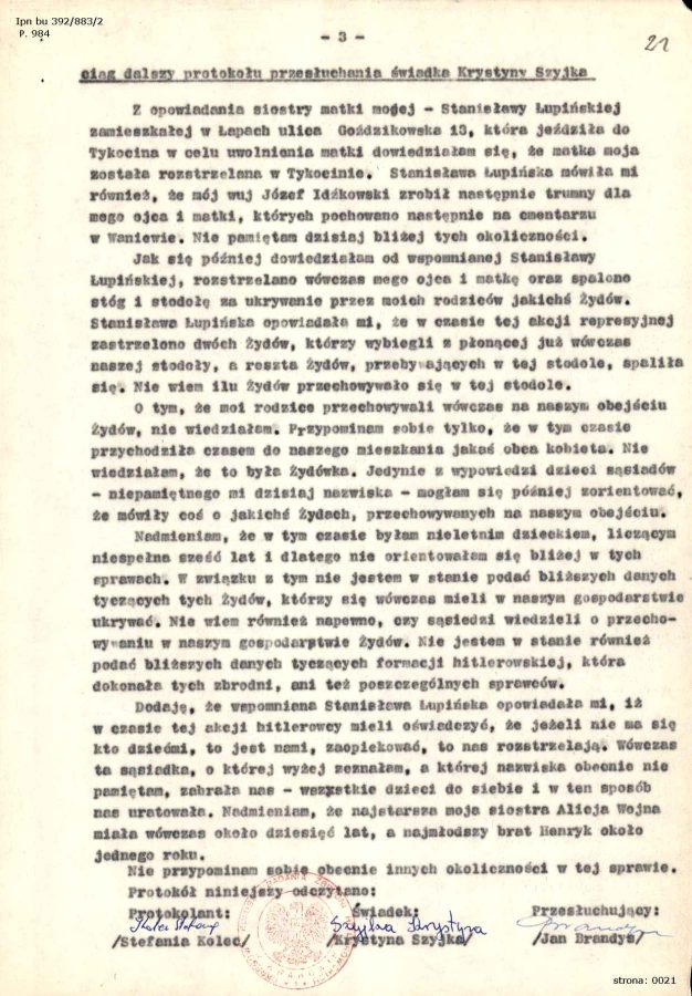 W nocy z 7 na 8 września 1943 roku gospodarstwo otoczyli niemieccy żandarmi. Wywlekli Stanisława z domu, pobili go do nieprzytomności, wreszcie zastrzelili. Następnie podpalili zabudowania i zamordowali uciekających Żydów. Władysława zginęła trzy dni później, po serii brutalnych przesłuchań w areszcie w Tykocinie.