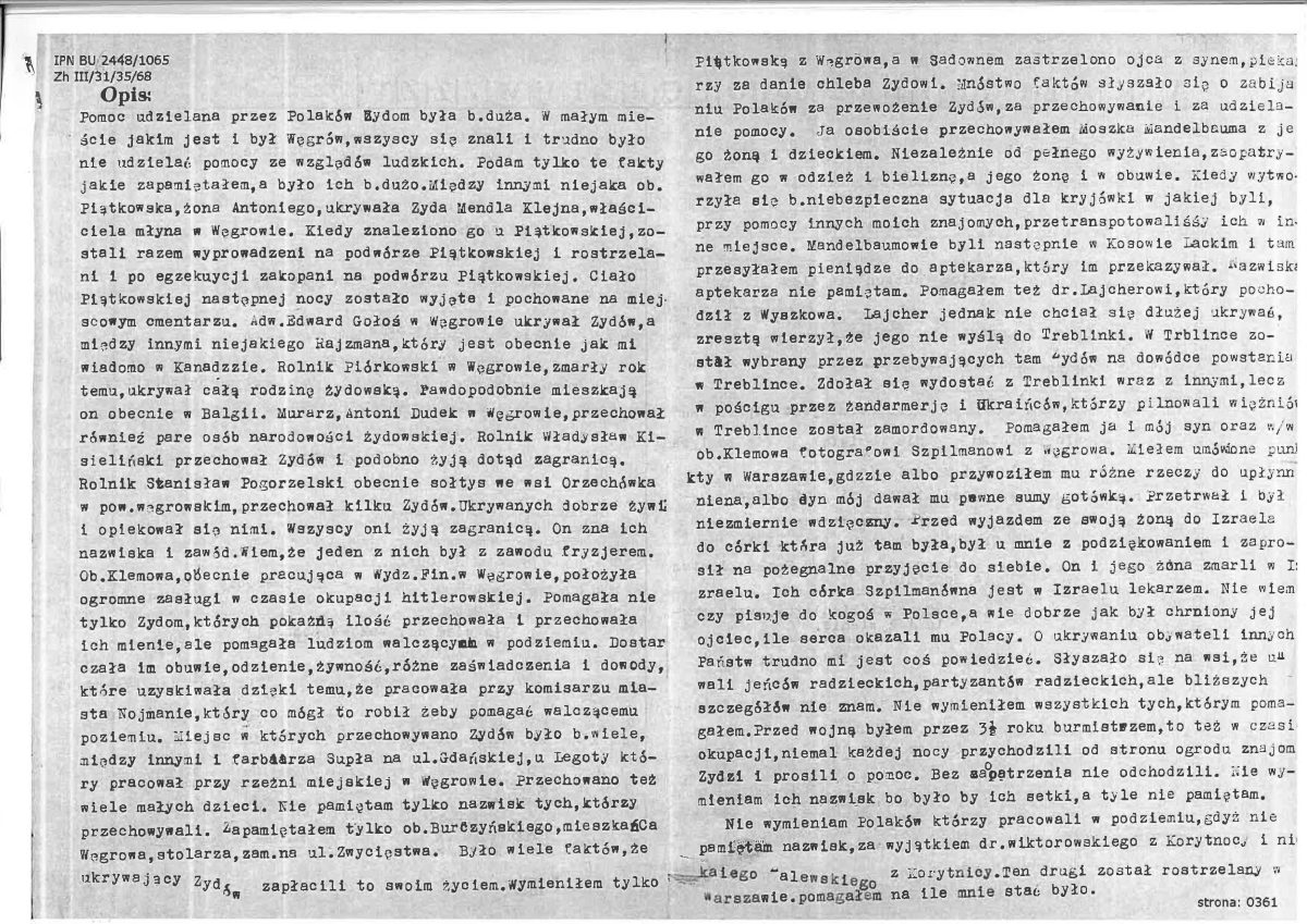 Leokadia i Antoni Piątkowscy prowadzili gospodarstwo na obrzeżach Węgrowa. Pewnego dnia krewny Antoniego przyprowadził do nich dwóch Żydów – Mendla Kleina i nieznanego mężczyznę, zbiegłych ze zlikwidowanego przez Niemców węgrowskiego getta. Piątkowscy nie odmówili pomocy, mimo że w niewielkim domostwie mieszkali z liczną dziewięcioosobową rodziną. Przyjętym mężczyznom przygotowali kryjówkę w oborze.